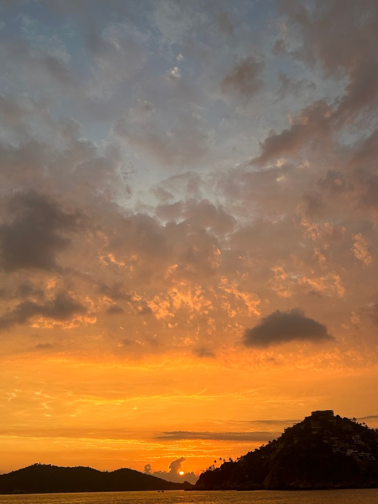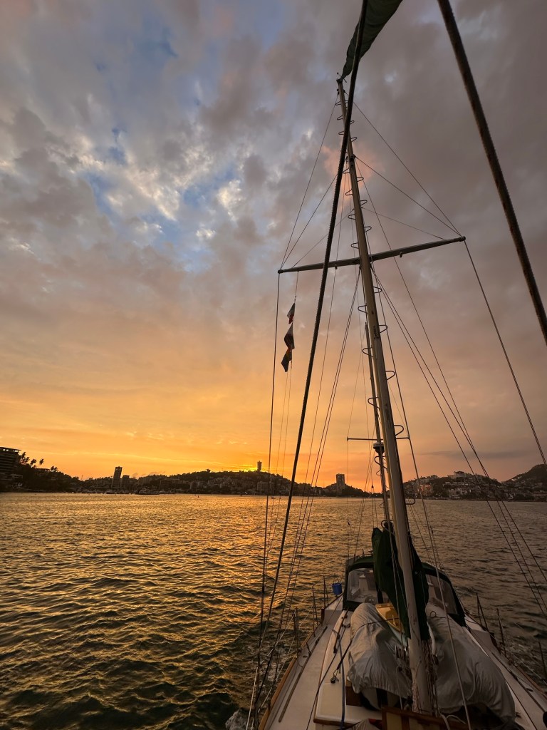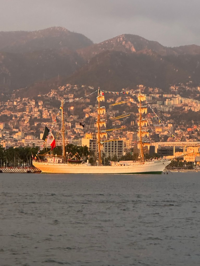Cuauhtemoc in Acapulco looking good after hitting the Brooklin bridge last year and losing part of her mast.A goodbye sunset