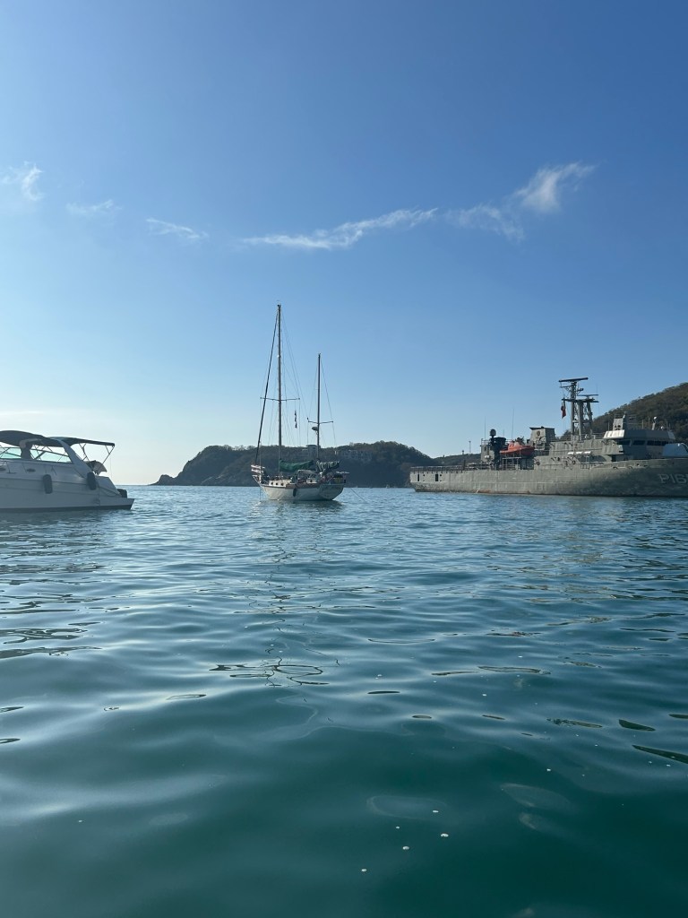 The cruis ship won!School work on the high seas.This was a turtle fest. Worried we might hit one.Pulled into Bahia Chachacual, one of the nine bays of Hualtuco. On our last visit here 20 years ago most of the bays were secluded quiet anchorages. Fonatur the government agency that gave us Cancun and Ixtapa developed Hualtuco 25 years ago and it looks like it finally caught on. Between 10 & 2 it was a madhouse Ferries and pangas and private boats flying around. At least we had a few hours to enjoy the solitude. This is where you have to anchor to wait out a weather window to cross the dreaded Tuantepecs. Unfortunately the best anchorage, Santa Cruz, is full of pangas so there is no room for visitors. There is Marina Chauay but it is silted in. We could have gone in on high tide but they had no room. So we anchored on the side of the channel next to the cruise ship dock and waited for the port captain to kick us out. Fortunately the didn’t bother us even though we were right next to a naval destroyer.