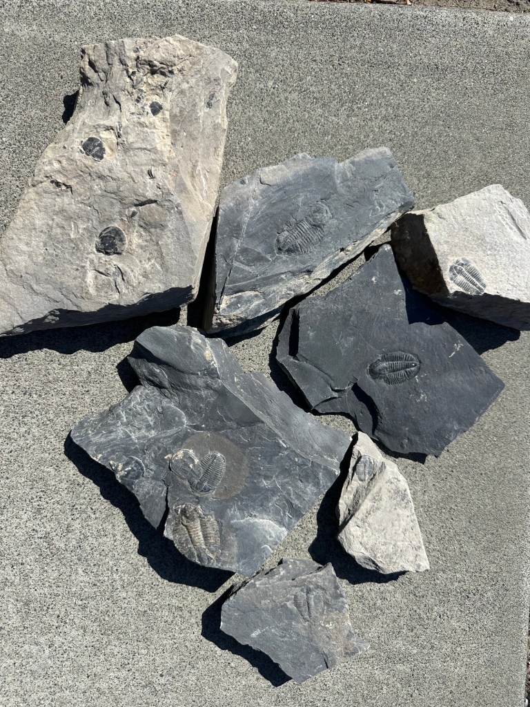 Syd requested a stop at a fossil dig about 50 miles down the highway and then 20 miles down a dirt road. And what do you know, another thunder storm lingered on the ridge to our south. We got a little rain and with the ptsd from the last off road experience, dad was on the hot seat. We arrived at the dig unscathed but had to hide in the car while lightning struck the hills where we were planning to dig. It was way more fun than than I’d imagined. You use a rock hammer and split slabs of slate to see if any fossils lie between the layers. Every rock that’s split is a surprise. Usually nothing but rock, but then you open one and there it is, a 200 million year old creature.